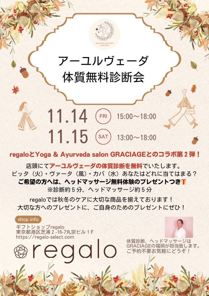 芝浦2丁目のギフトショップregloと海岸3丁目のYoga & Ayurveda salon GRACIAGEさんとのコラボ企画が開催されます。