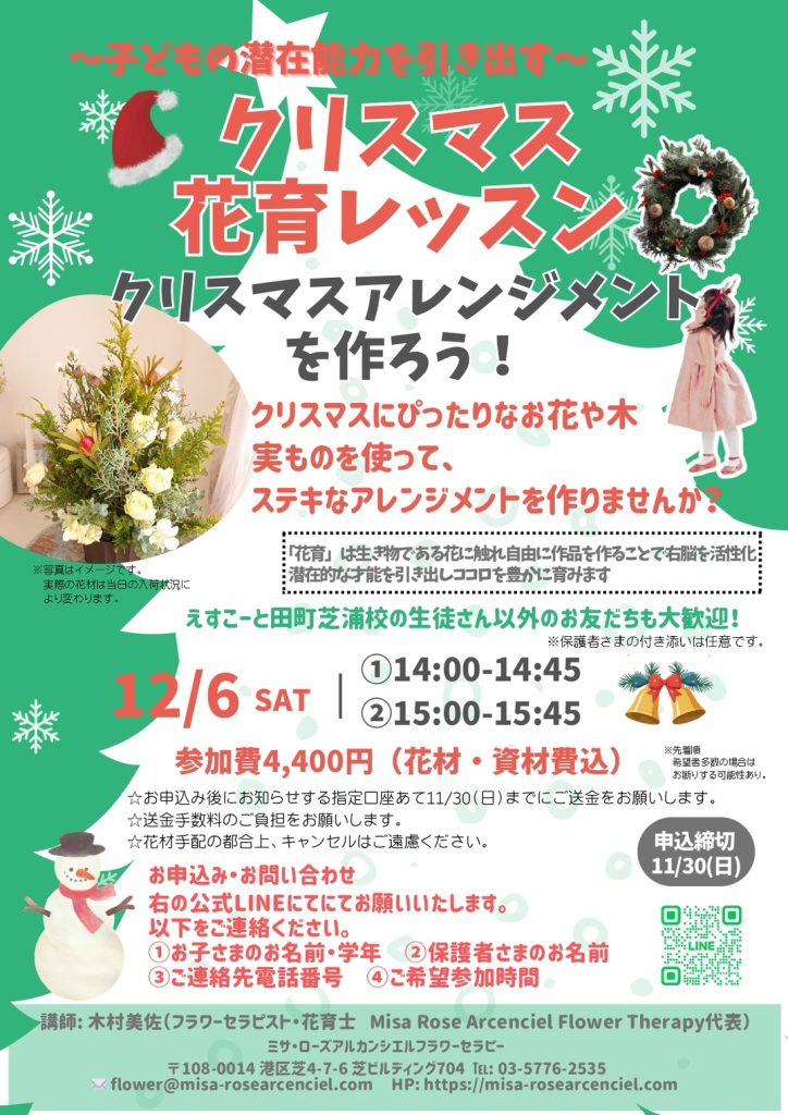 芝浦2丁目のえすこーと田町芝浦校さんで、「クリスマス花育レッスン クリスマスアレンジメントを作ろう!」が開催されます!