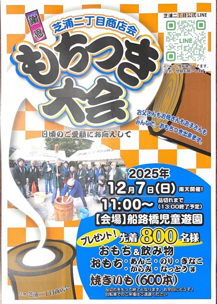 12月7日(日)に芝浦二丁目商店会謝恩もちつき大会が船路橋児童遊園で開催されます。
