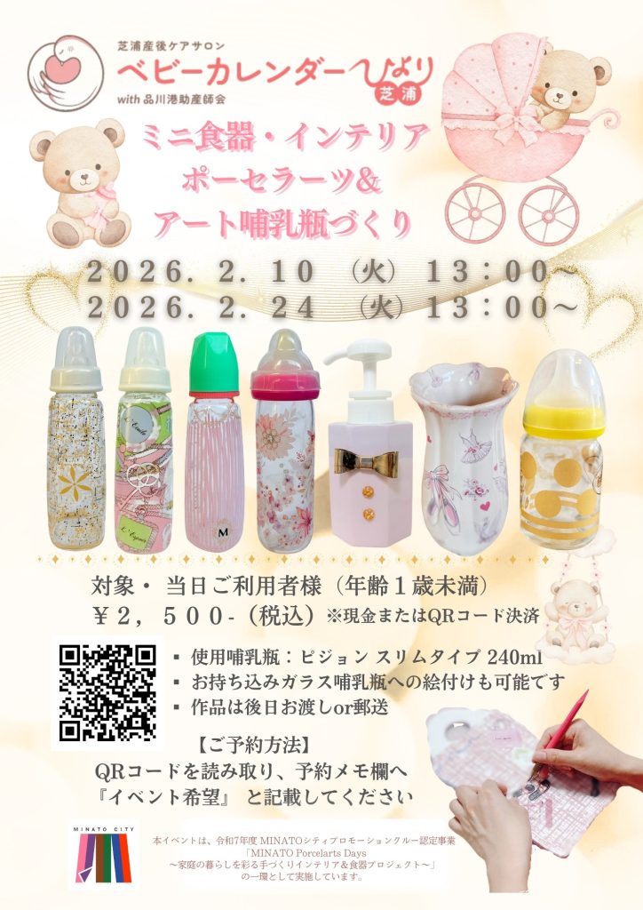 産後ケアサロン「ベビーカレンダーひより芝浦」を当日ご利用中のお母さん限定で、ミニ食器やインテリア、ガラス哺乳瓶への絵付けができるポーセラーツ体験イベントです。