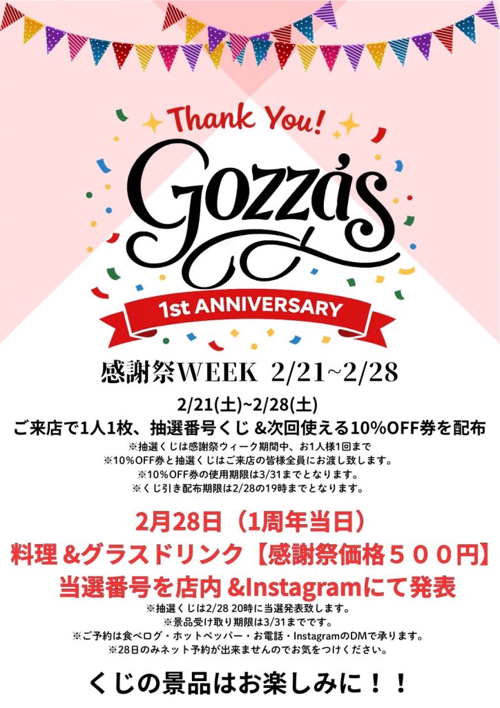【イベント情報】芝浦|Gozzás 1周年感謝祭WEEK(2月21日(土)〜2月28(土))開催!